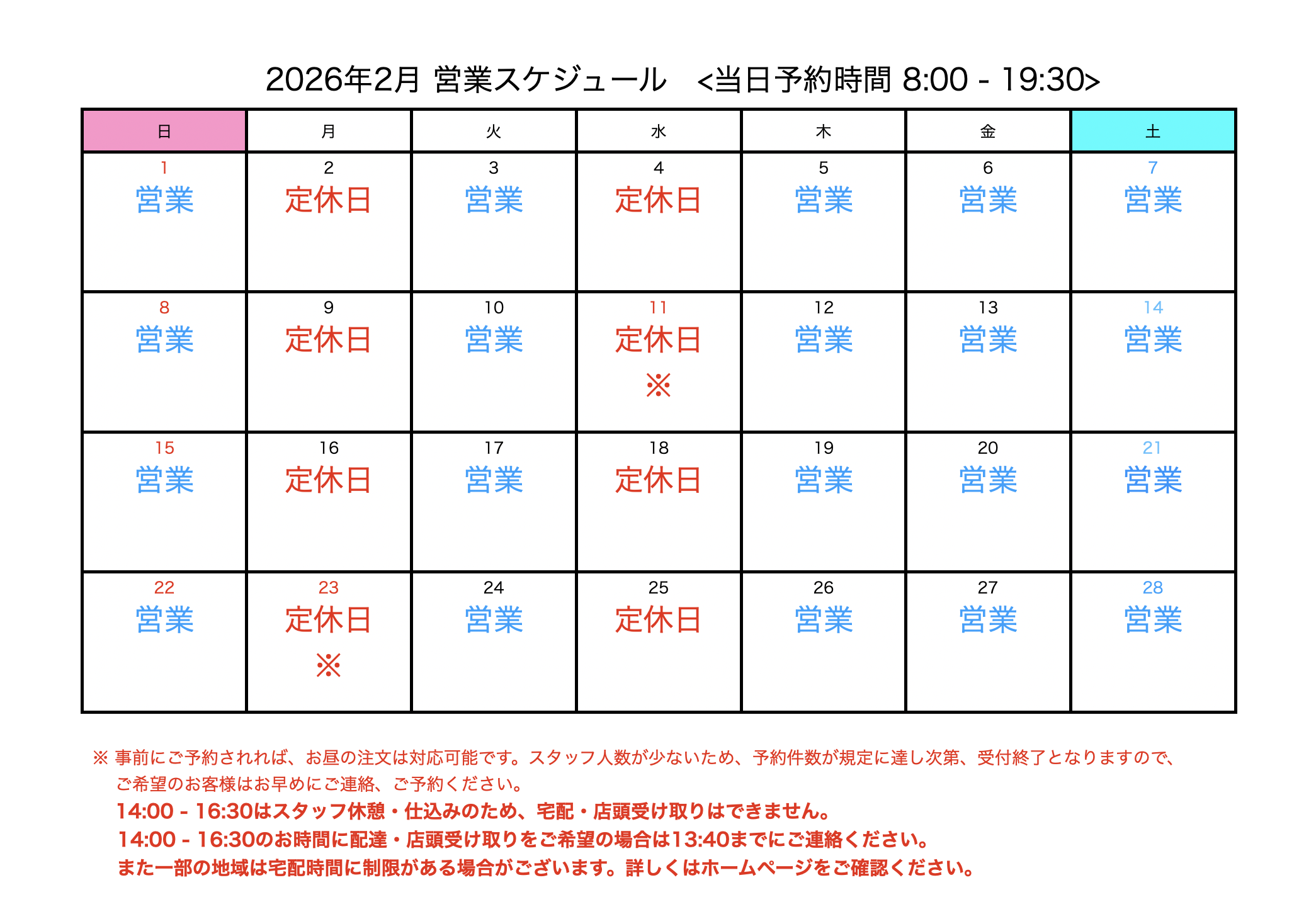 宅配・店頭対応・店頭受取・・・11:00〜20:00