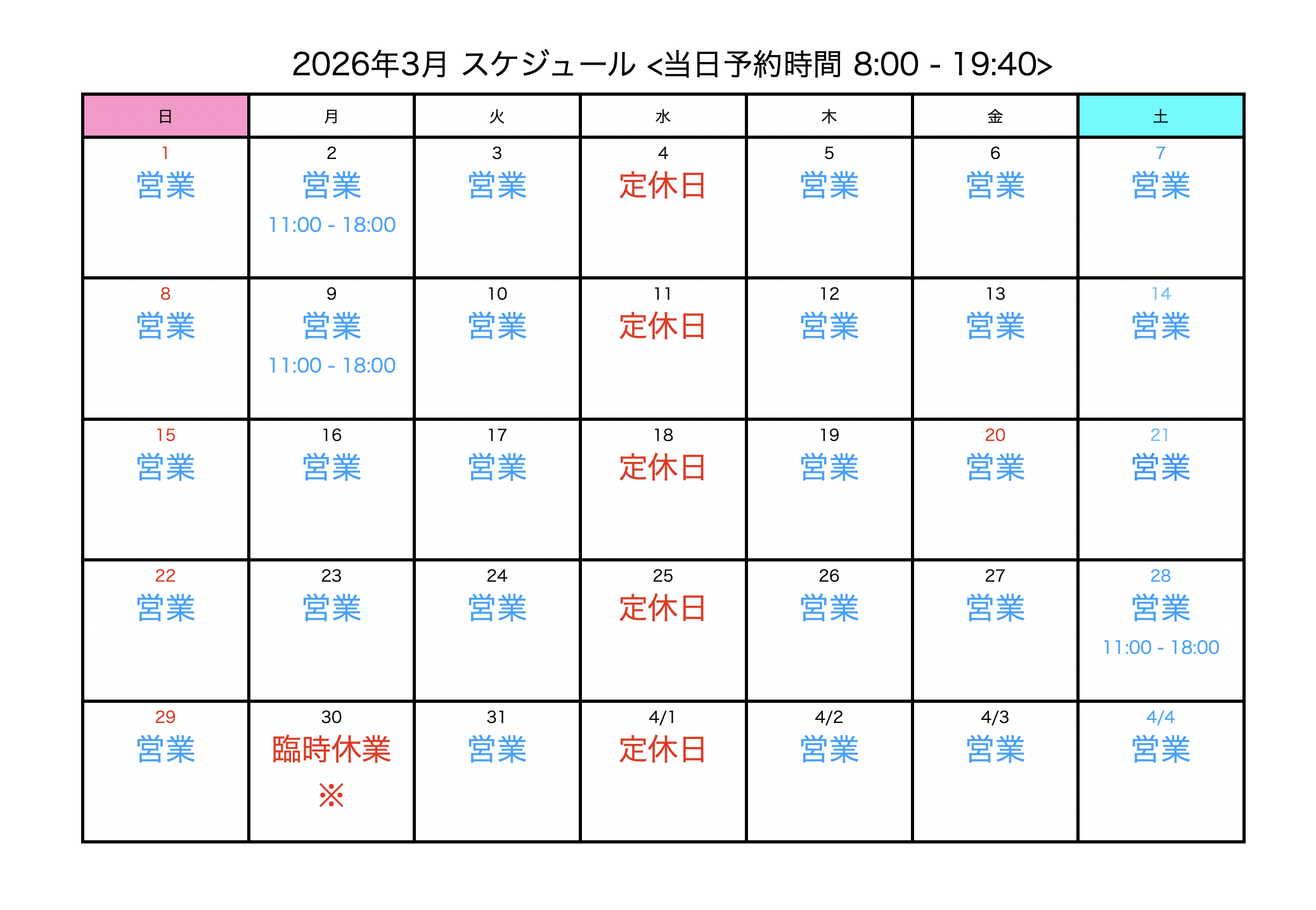 2026年2月〜3月の営業スケジュール